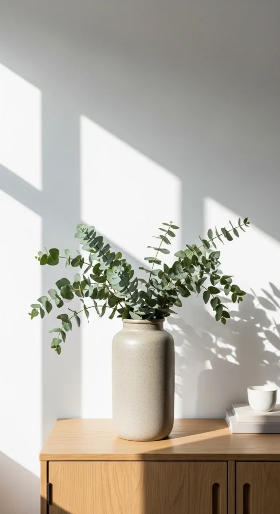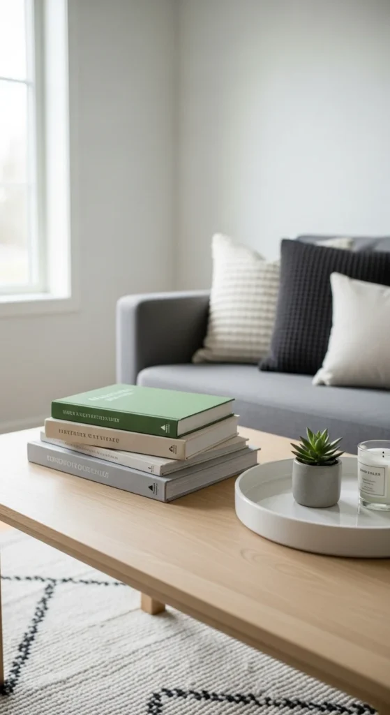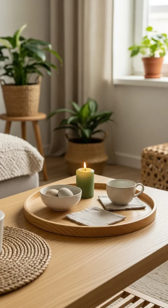 A styled tray helps anchor small green elements without spreading them across the room. This approach keeps everything contained and intentional.