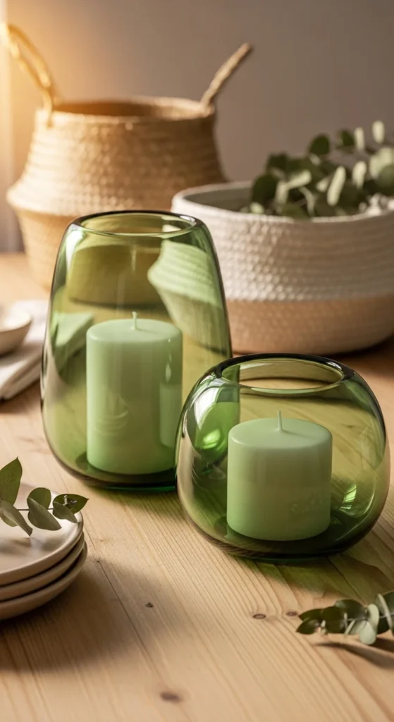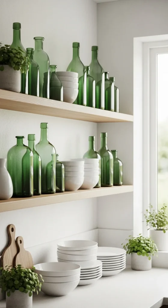 Reusing green glass bottles adds color without buying new decor. This eco-friendly option aligns well with Scandinavian values.