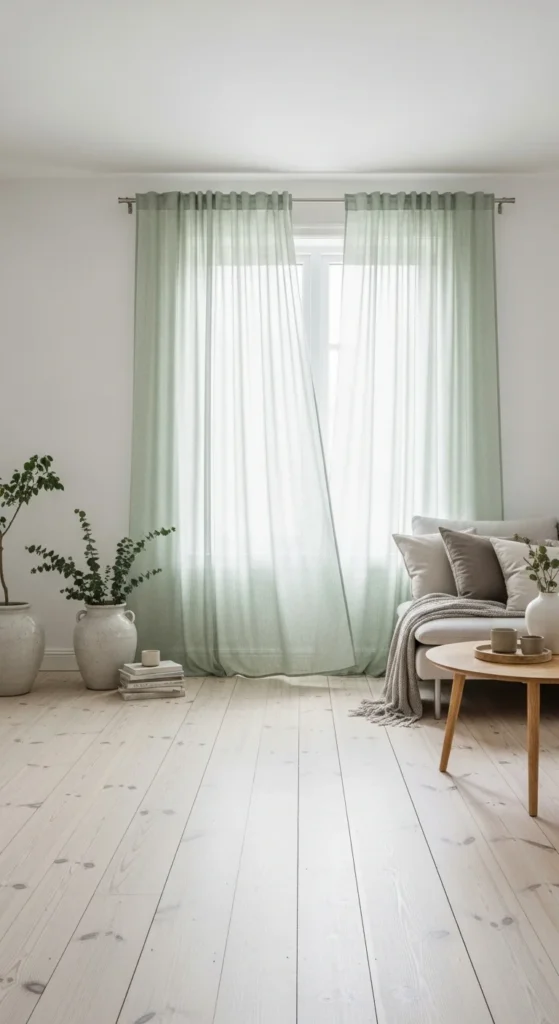 Textiles like curtains introduce color softly across the entire room without feeling decorative or themed.