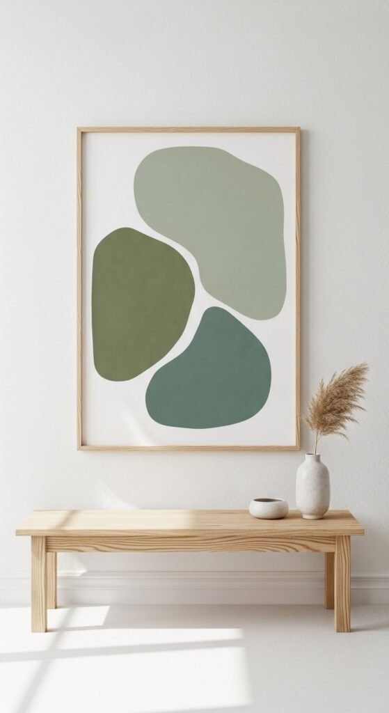 Instead of holiday signs, choose abstract or nature-inspired art that subtly references green tones. It feels timeless and reusable beyond the season.