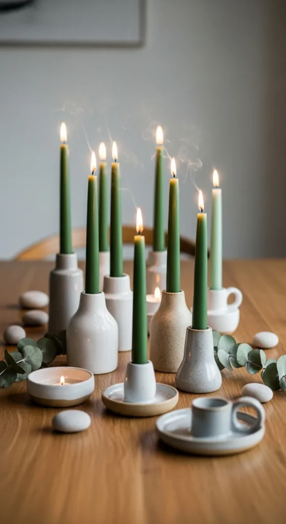 Candles instantly bring warmth and atmosphere. Choosing muted green tapers nods to St Patrick’s Day while keeping the look refined.