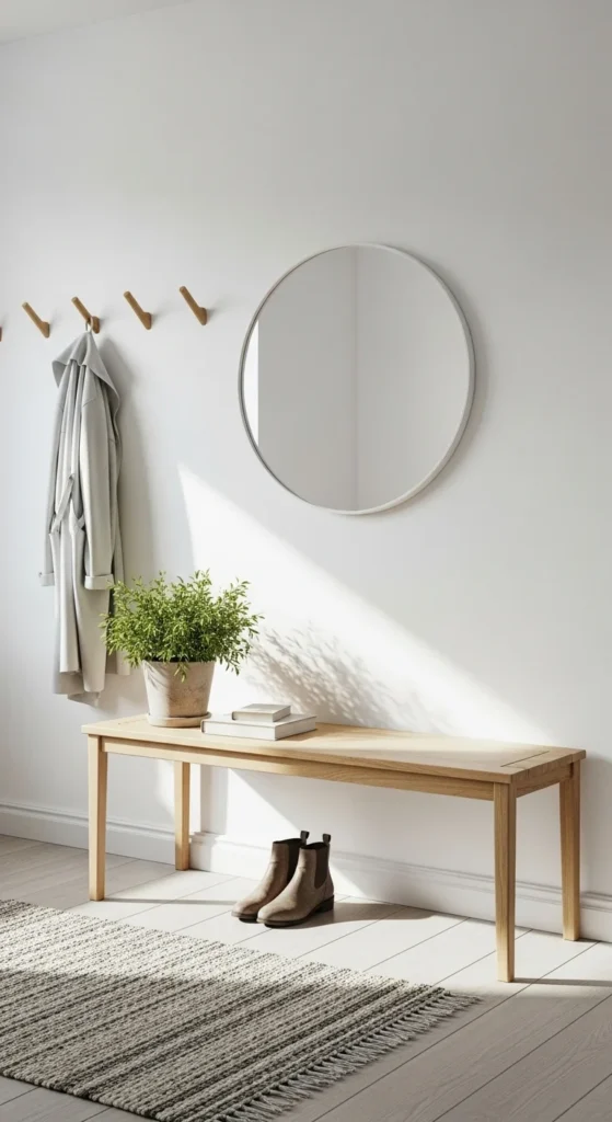 A single plant in the entryway sets a calm tone as soon as guests arrive. It feels welcoming without being overtly festive.