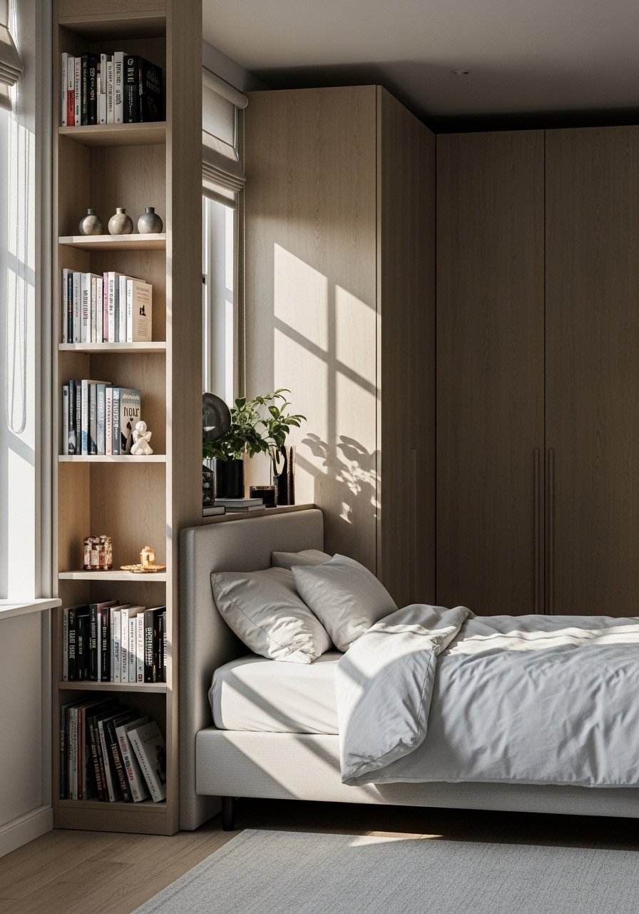 Place furniture so it reads built-in. I flanked my bed with matching nightstands and tall shelving. The symmetry makes the wall look custom. In small rooms, scale down with narrow shelving. The cheap version is mismatched heights that feel accidental. Keep consistent finishes to sell the built-in effect. White oak finishes are trending. White oak floating shelves pair well with natural wood dressers.