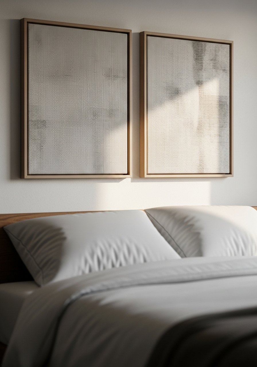 Framed textile panels give the look of custom art for less. I stretched a patterned linen over simple frames for instant scale above the bed. It looks expensive in photos and in person. The common mistake is choosing too-small pieces. Aim for at least 60 percent of the bed width combined. Framed fabric panels 24×36 set are easy to source.