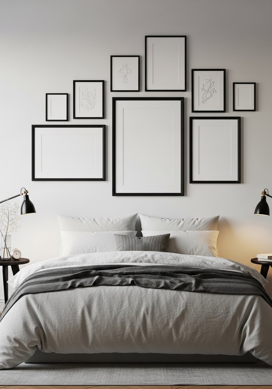 I keep seeing black frames everywhere this year. A unified frame color makes mixed artwork read intentional. For scale, I fill a 6-foot-wide wall with an odd number of pieces, usually seven to nine. This approach is ideal for modern and minimalist bedrooms. Budget: $60-300 based on print choices. The common error is choosing too many tiny frames. In practice they get lost. Use larger mats or at least two 11x14s mixed with smaller 8x10s. Try mat-ready black frames for a clean look.