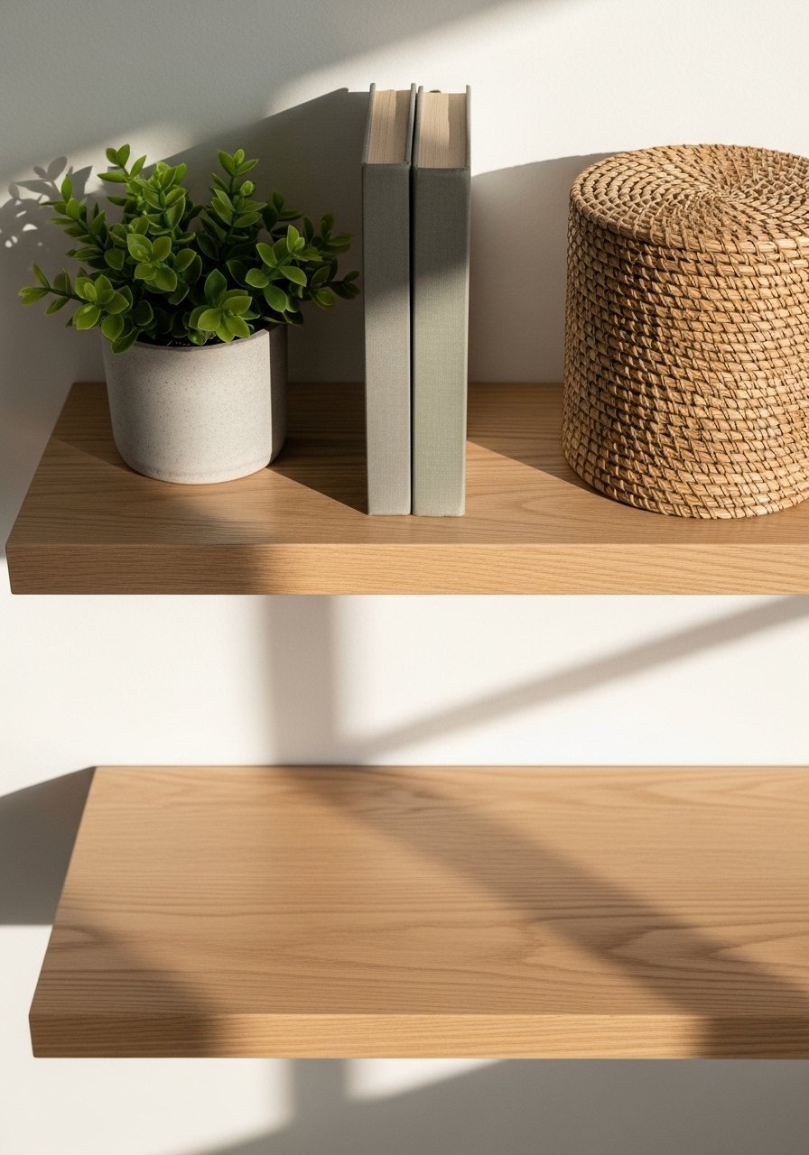 I keep seeing white oak shelves in showrooms. Floating shelves give depth without bulk. Use the 60-30-10 rule for styles: 60 percent wood, 30 percent plants and books, 10 percent art or ceramics. Works in boho and modern bedrooms. Budget: $45-100 for a set. A cheap version looks cluttered when shelves are overloaded. In small rooms, stick to one shelf depth 8-10 inches. I recommend white oak floating shelves.