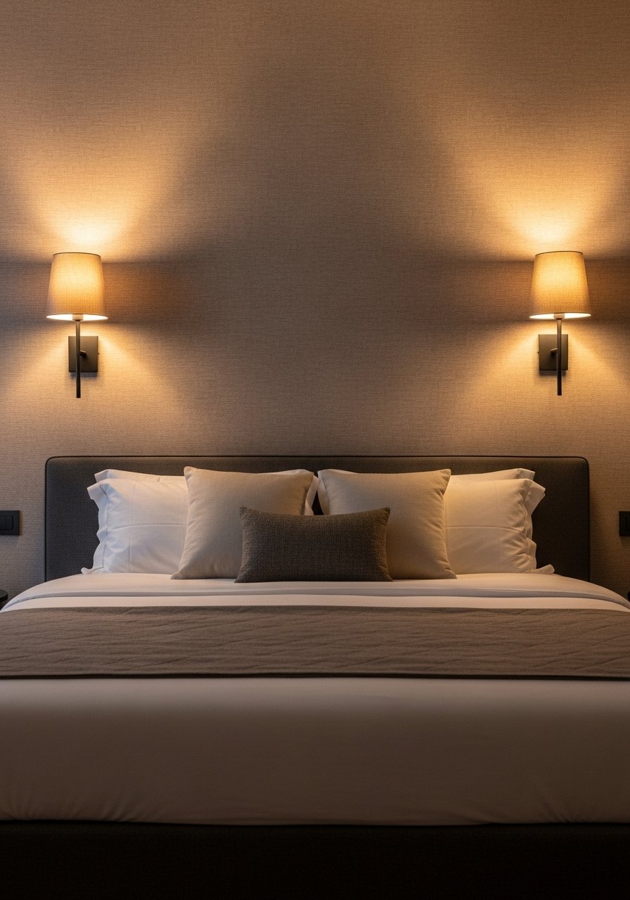 Swapping table lamps for wall sconces frees up nightstand space and frames the bed. I installed black metal sconces to contrast light bedding. Works great in small bedrooms and modern styles. Budget: $40-120 per sconce. People often pick low-lumen bulbs that read harsh in photos. Use warm LED Edison bulbs for a softer glow. Try black metal sconce with fabric shade.