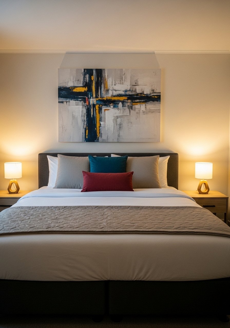 One oversized piece reads intentional and reduces clutter. I went with a 48×36-inch canvas and it made the bed feel anchored. Budget: $75-250. The mistake is choosing art that is too small for the headboard width. Aim for art that is roughly two-thirds the width of the bed. For a quick buy, try large abstract canvas art 48×36.