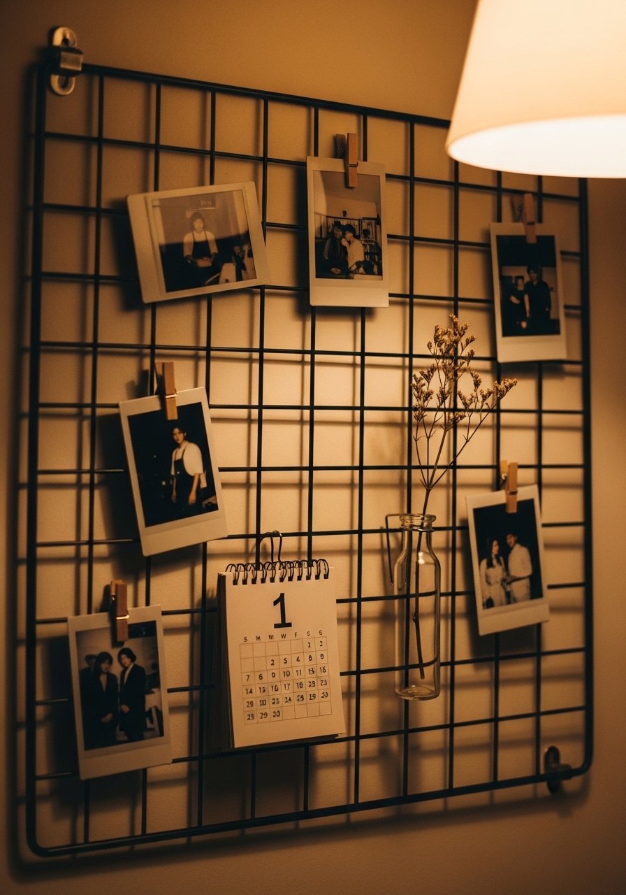 A wire grid is great for renters and adds a casual, modern edge. I clip prints and a small calendar for rotation. Budget: $15-40. The cheap look is when grids are overloaded. Keep a 60-40 rule, 60 percent photos and 40 percent negative space. For a starter, get a black wire grid panel.