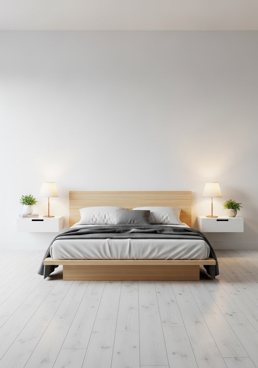 Floating nightstands free floor space and make small bedrooms feel airy. I installed ours at a comfortable elbow height, 24 inches from the mattress top. Budget: $80-200. A mistake I saw was mounting them too low, which ruins ergonomics. Pick nightstands 20-28 inches high depending on mattress thickness. For a ready-made option, view floating nightstand wall mounted.