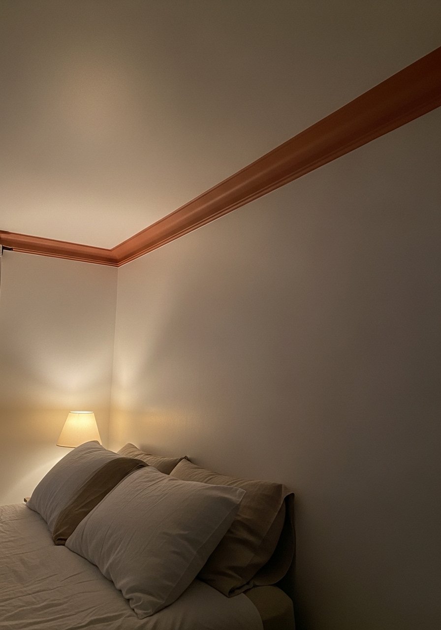 Painting the ceiling edge in a warm tone makes a room feel enclosed in a pleasant way. I used terracotta and it reads cozy in photos and intimate in person. Budget: $15-60 for paint. People avoid this because it feels permanent. Use sample pots first and limit to the outer 12 inches. For paint choice, try a warm latex sample from your local store.