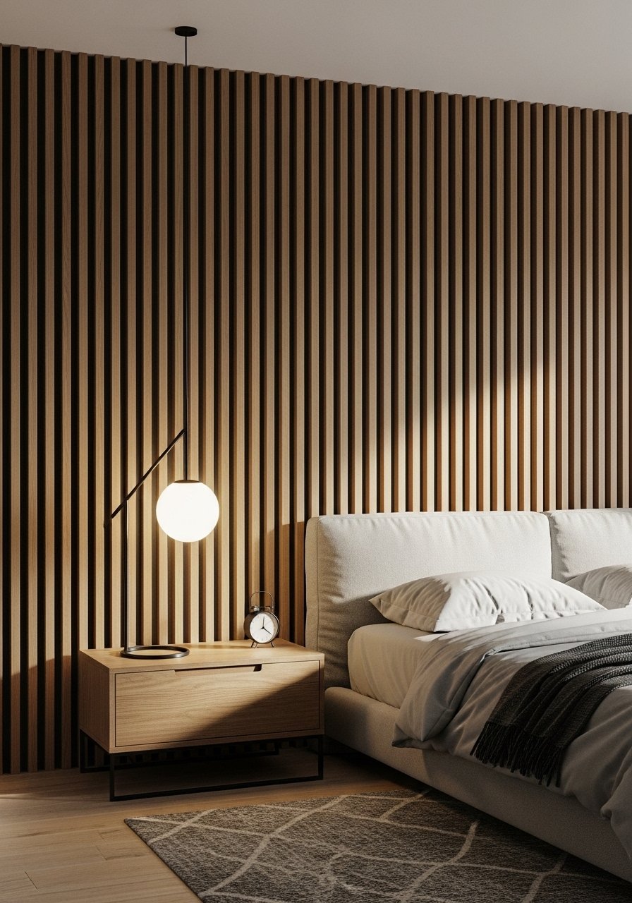 Wood slats add rhythm and warmth. I installed narrow slats to avoid overwhelming a small wall. Works in Scandinavian and modern bedrooms. Budget: $120-350 depending on material. A common error is choosing too-dark wood, which can make a room feel closed. White oak or maple tones work best. Look for white oak slat wall panels.