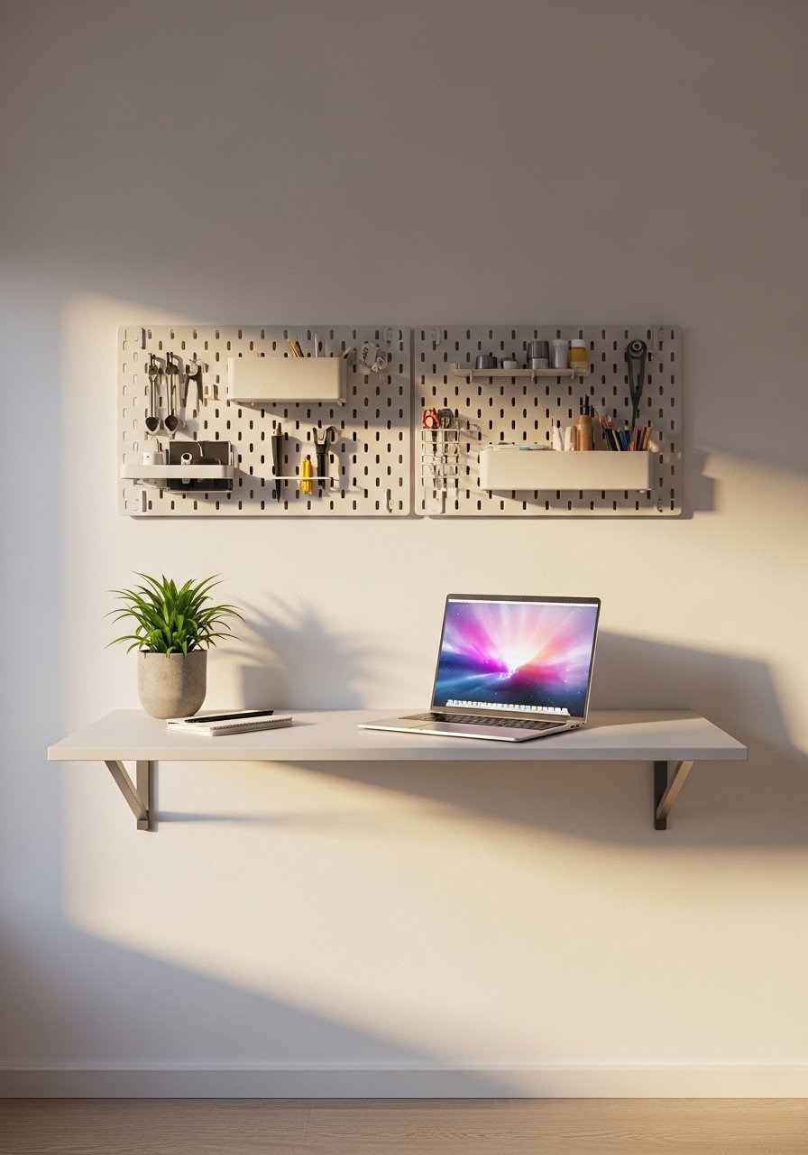 Minimal Floating Desk Nook with Wall Pegs for Small Bedrooms
