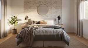 Wood slats add rhythm and warmth. I installed narrow slats to avoid overwhelming a small wall. Works in Scandinavian and modern bedrooms. Budget: $120-350 depending on material. A common error is choosing too-dark wood, which can make a room feel closed. White oak or maple tones work best. Look for white oak slat wall panels.