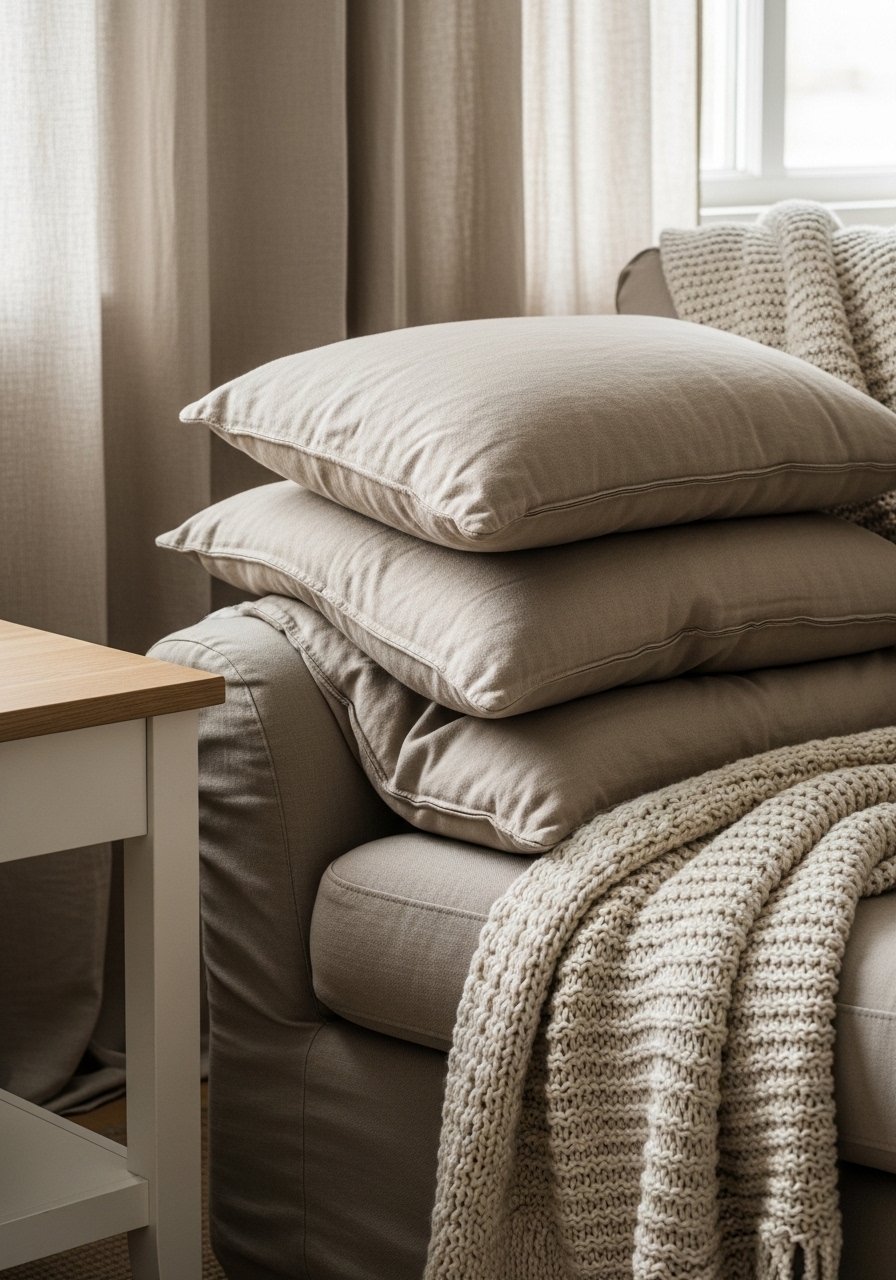 Tonal layering is about contrast in texture, not color. I pair a warm sand linen pillow, a cool oat velvet, and a cream knit throw to get depth. Use this cream chunky knit throw and 22-inch velvet cushions for variation. Odd numbers work; I use three pillows plus one lumbar. Mistake to avoid: matching fabrics exactly. If every cushion is linen, the sofa still reads flat instead of textured and intentional.