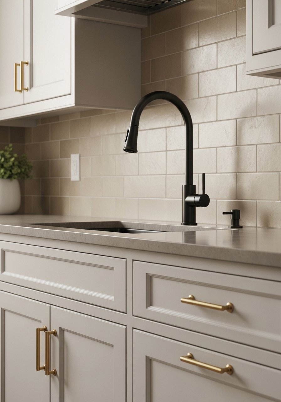 A soft beige tile backsplash with slightly darker grout adds pattern and interest without high contrast. I used peel-and-stick tiles for a renter-friendly upgrade and paired them with brass hardware. Try beige subway peel-and-stick tile for an easy refresh. Mistake to avoid: using white grout with beige tile—it can look unfinished. Warm grout ties the look together.