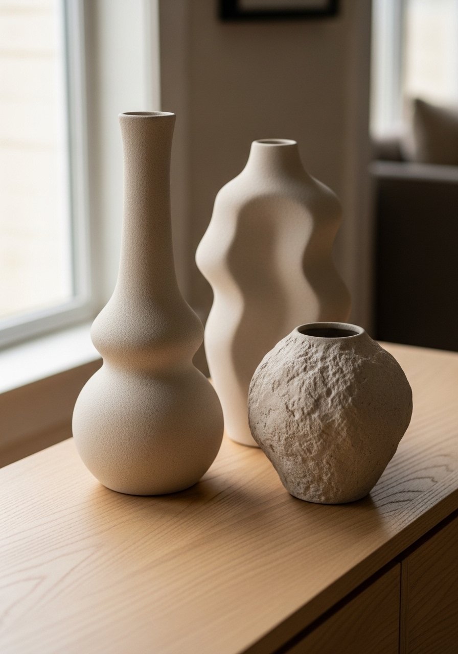 Sculptural ceramics add shape to a beige scene. I group three vases in different heights and textures on a white oak console. These neutral forms read like art and work with dried grasses or eucalyptus. I lean on tactile pieces like matte ceramic vases in neutral sets. Mistake to avoid: matching sizes. Use height variation and odd numbers so the group reads curated, not store-bought.