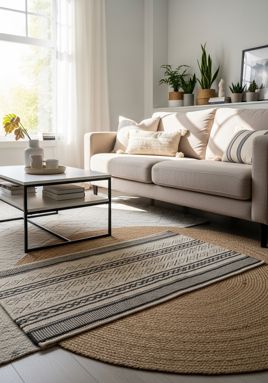 Layering a natural jute base with a low-pile patterned rug adds dimension without color overload. My jute is 8×10, with a 6×9 patterned rug on top, front legs anchored on the top rug. I prefer 8×10 jute area rugs for grounding. Mistake to avoid: using two rugs that compete. Let the top rug be more detailed and the bottom rug a neutral texture to keep the palette cohesive.