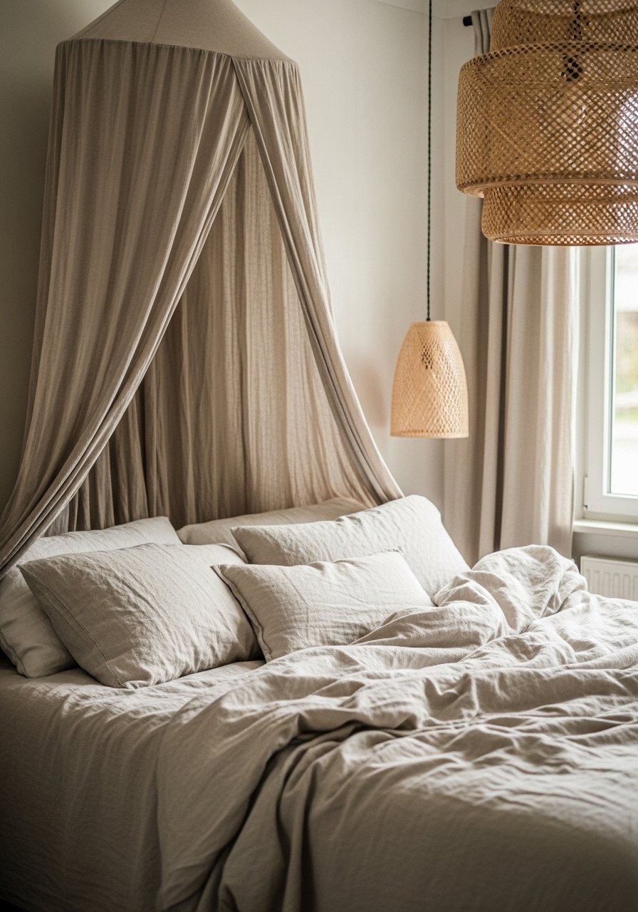 A linen canopy softens a bedroom and adds vertical interest. I used a lightweight 100% linen panel hung from a hoop above the bed. It makes beige bedding feel intentional, not bland. I recommend 96-inch panels so they puddle slightly. Try linen canopy curtains if you want the look without a frame. Mistake to avoid: heavy fabrics that overwhelm small rooms—keep canopy fabric airy.