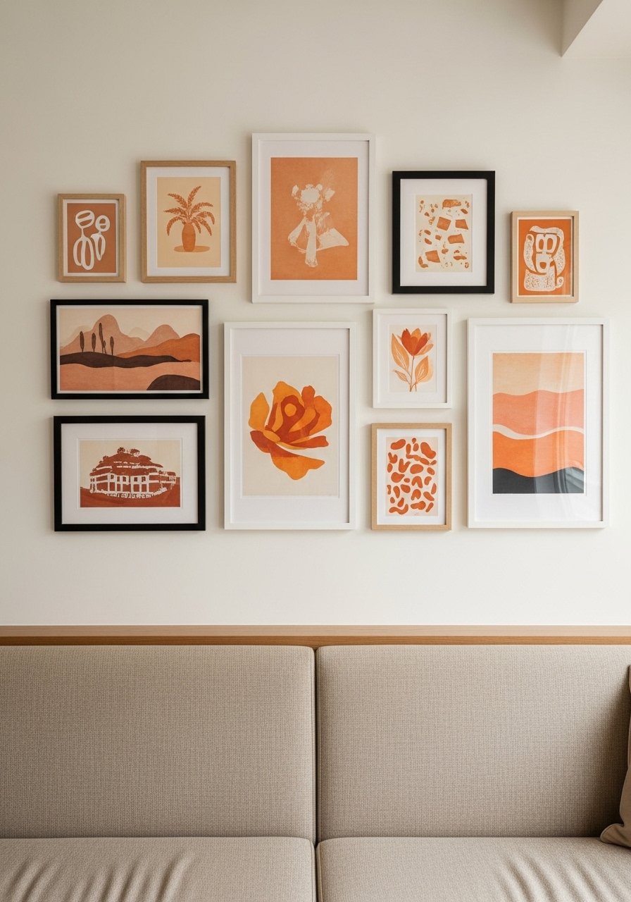 A gallery wall in warm neutrals anchors a beige banquette. I mix black frames and white oak frames for contrast and use 11×14 and 8×10 prints. Start with a large central piece and build around it in odd numbers. I used mixed wood picture frames set. Mistake to avoid: tiny frames too close together. Leave breathing room so the beige walls still read as part of the composition.