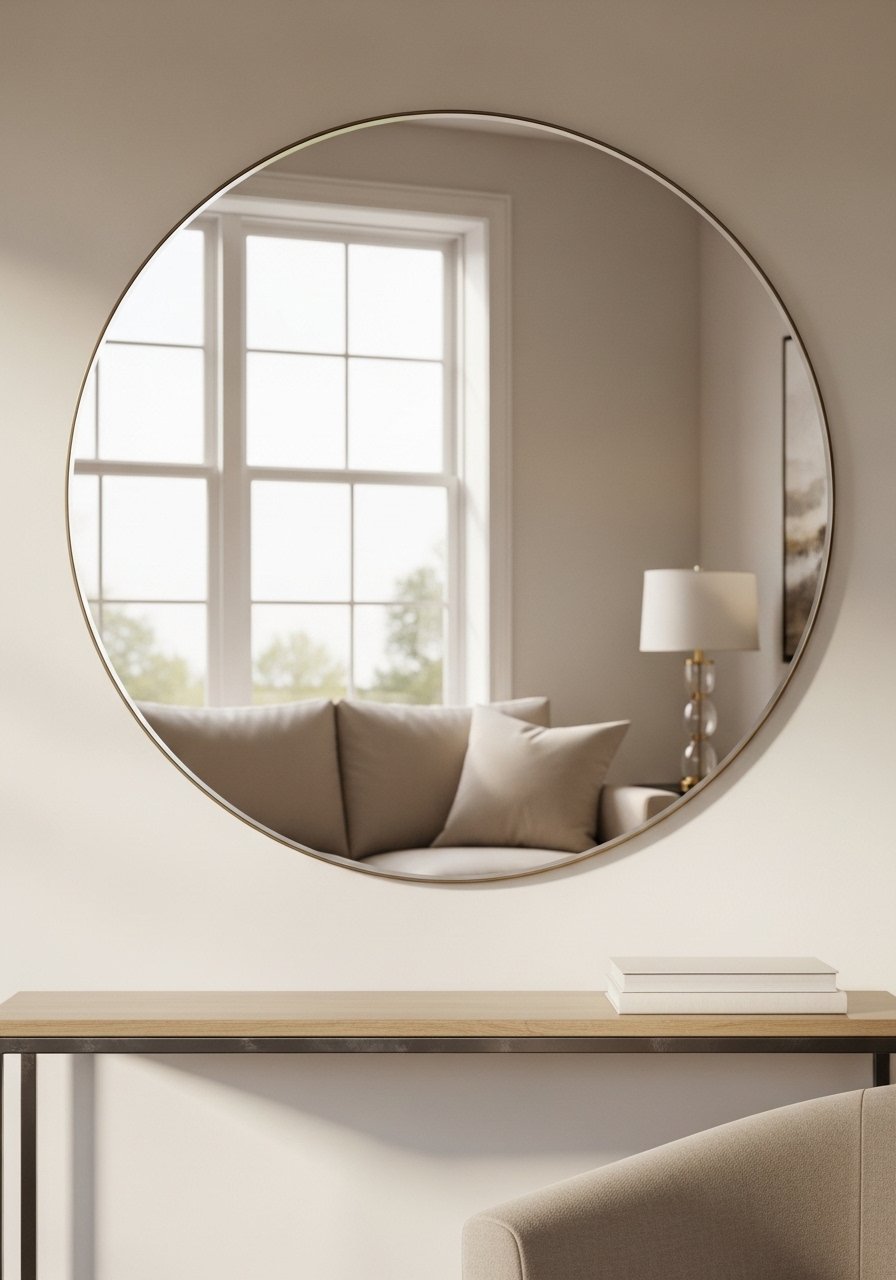 A large round mirror reflects light and makes beige rooms feel airier. I chose a 36-inch with a slim warm wood frame to keep things soft. Place it opposite a window when possible. I used this 36-inch round mirror and noticed the room felt twice as bright. Mistake to avoid: heavy ornate frames that read too formal—keep lines simple to maintain the relaxed beige vibe.