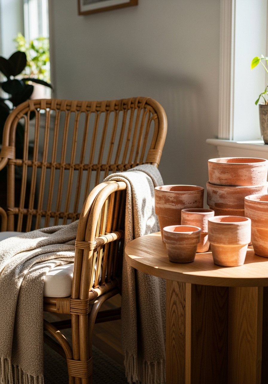 Terracotta introduces a sun-baked warmth that complements beige perfectly. I mixed small terracotta planters and a larger floor vase near a rattan chair. The clay texture pairs well with linen and jute. Try a set of terracotta planters in mixed sizes. Mistake to avoid: using bright glazed clay that clashes. Stick to matte, earthy terracotta for subtle warmth.