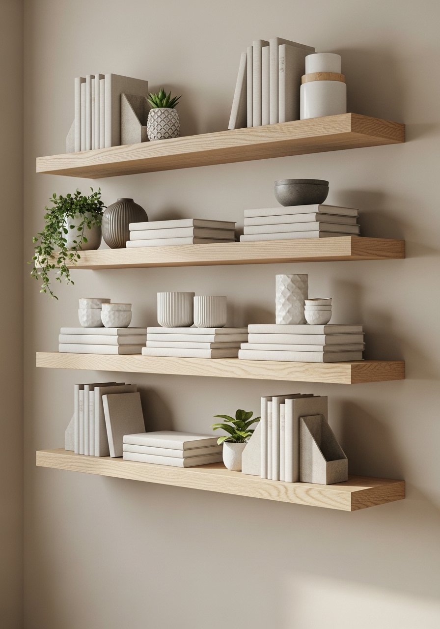 Floating shelves are a simple way to add rhythm to beige walls. I spaced three white oak shelves asymmetrically and styled them with books, a ceramic vessel, and a trailing plant. Use odd numbers and vary heights. These white oak floating shelves are sturdy and modern. Mistake to avoid: over-styling every shelf. Leave negative space so the beige backdrop still breathes.