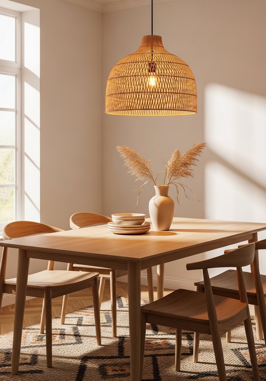 A rattan pendant brings shape and rhythm against beige ceilings. I swapped a dated fixture for a woven shade and used warm LED Edison bulbs for a soft glow. Try a 16–20 inch pendant for standard dining tables. I recommend this rattan pendant light shade. Mistake to avoid: too-small pendants that disappear—scale matters, especially over a table.