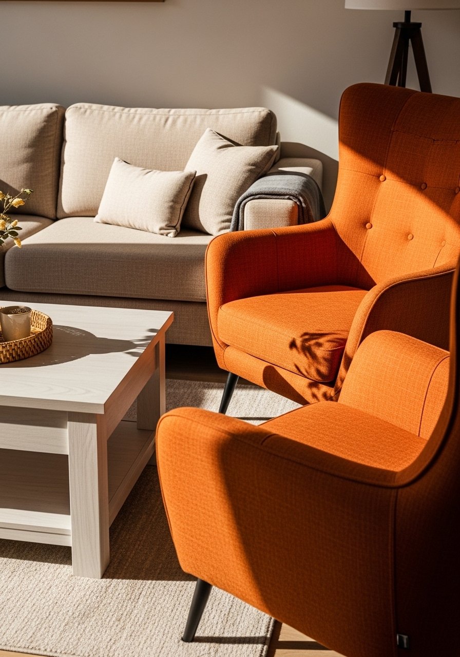 Pick one bold accent—like burnt orange or deep teal—and keep everything else beige and warm wood. I added a burnt orange lounge chair and a small throw to create a focal point. For ease, try burnt orange accent pillows before committing to larger pieces. Mistake to avoid: introducing multiple competing colors. One accent color keeps the beige base serene and intentional.