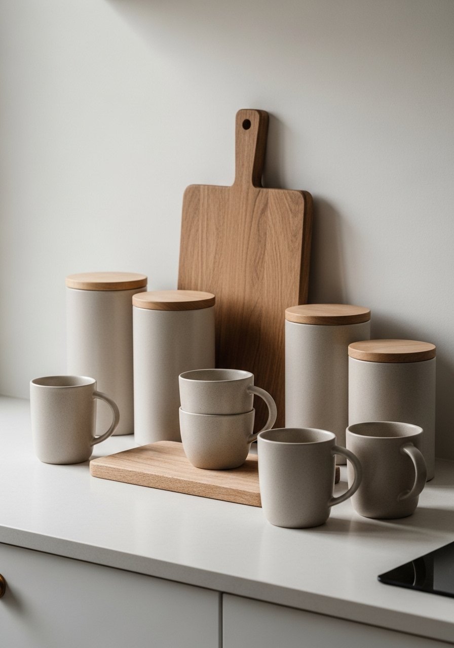 I swapped mismatched kitchenware for monochrome beige stoneware and a single warm wood cutting board to make open shelves look cohesive. Stoneware mugs, canisters, and a beige utensil holder tie everything together. Try beige ceramic kitchen canisters set. Mistake to avoid: mixing busy patterns—keep shapes simple and materials consistent to maintain a calm kitchen aesthetic.