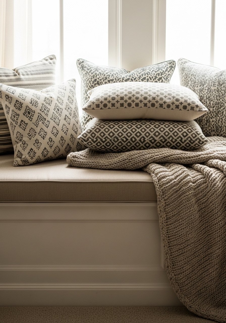 I mix stripes, ikat, and small-scale geometrics in the same beige and cream palette for interest without clashing. Keep one pattern large, one medium, and one small to balance scale. Use a lumbar pillow in a contrasting texture for punctuation. These neutral patterned throw pillows are an easy swap. Mistake to avoid: patterns all the same scale—they compete rather than complement.