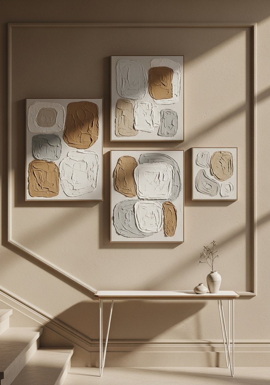 Textured neutral artwork reads as curated in a beige home. I hang layered canvases with plaster texture and mineral pigments above stairs to add movement. Choose large-scale pieces rather than many small ones to maintain serenity. I recommend neutral textured canvas wall art. Mistake to avoid: tiny, busy prints that disappear against beige—scale is the secret to impact.