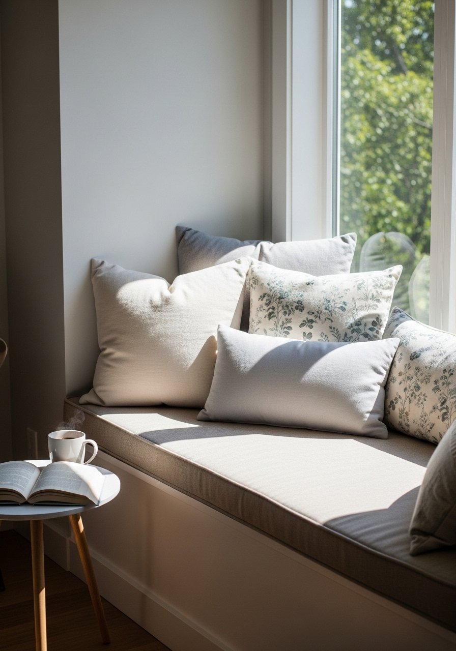 A built-in window seat with a tailored beige cushion becomes a room's favorite spot. My cushion is 24 inches deep and covered in outdoor-grade linen for easy cleaning. Layer euro pillows and one lumbar for reading comfort. I used 22-inch euro pillow inserts for the back. Mistake to avoid: a thin cushion—make it plush enough to sit comfortably for hours.