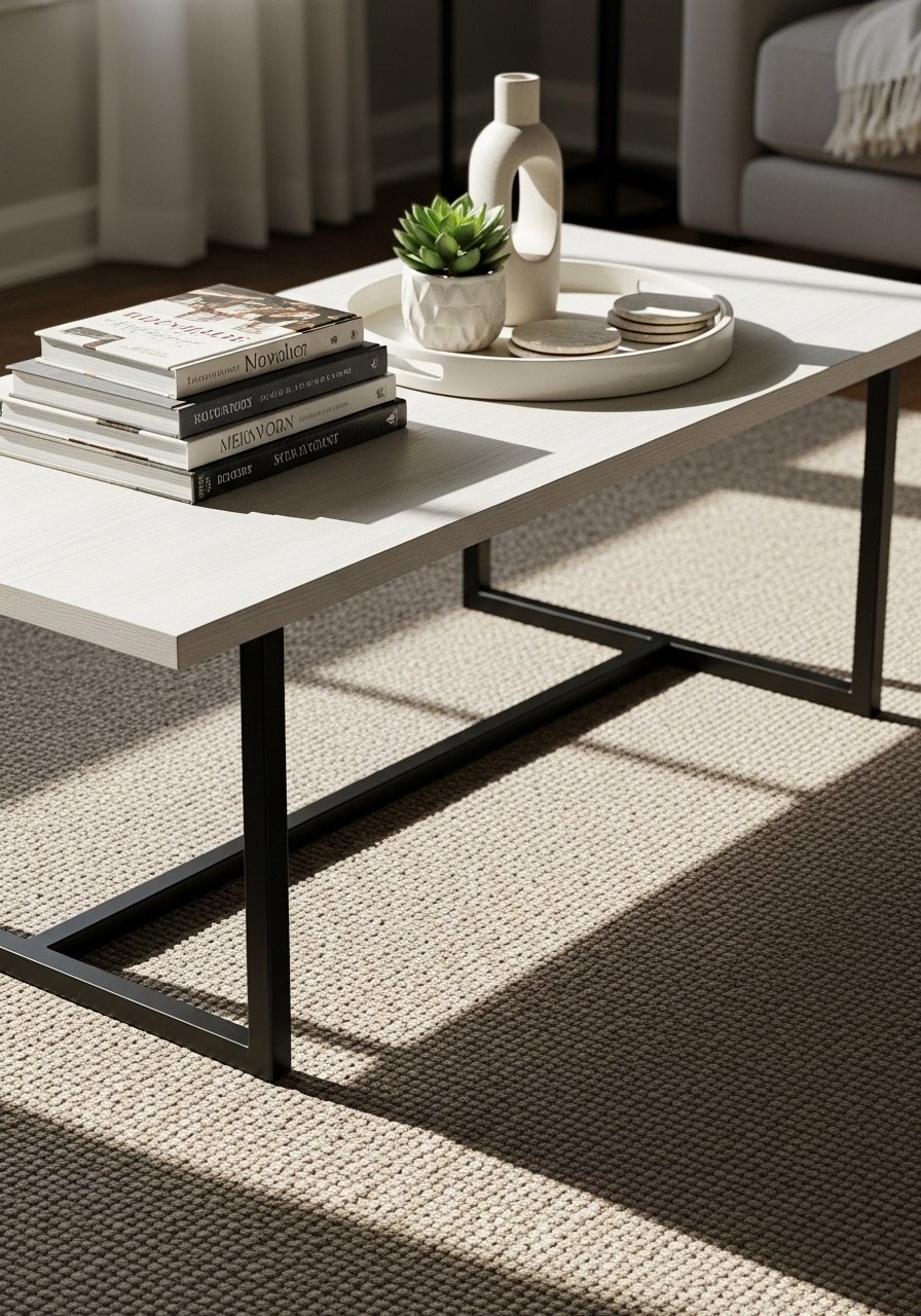 I prefer a coffee table that mixes wood, metal, or stone to anchor beige seating. My table has a white oak top with a matte black base for contrast. Style it with a ceramic tray and a small stack of books for balance. A white oak coffee table with metal base keeps the space grounded. Mistake to avoid: oversizing—keep traffic flow clear around the table.