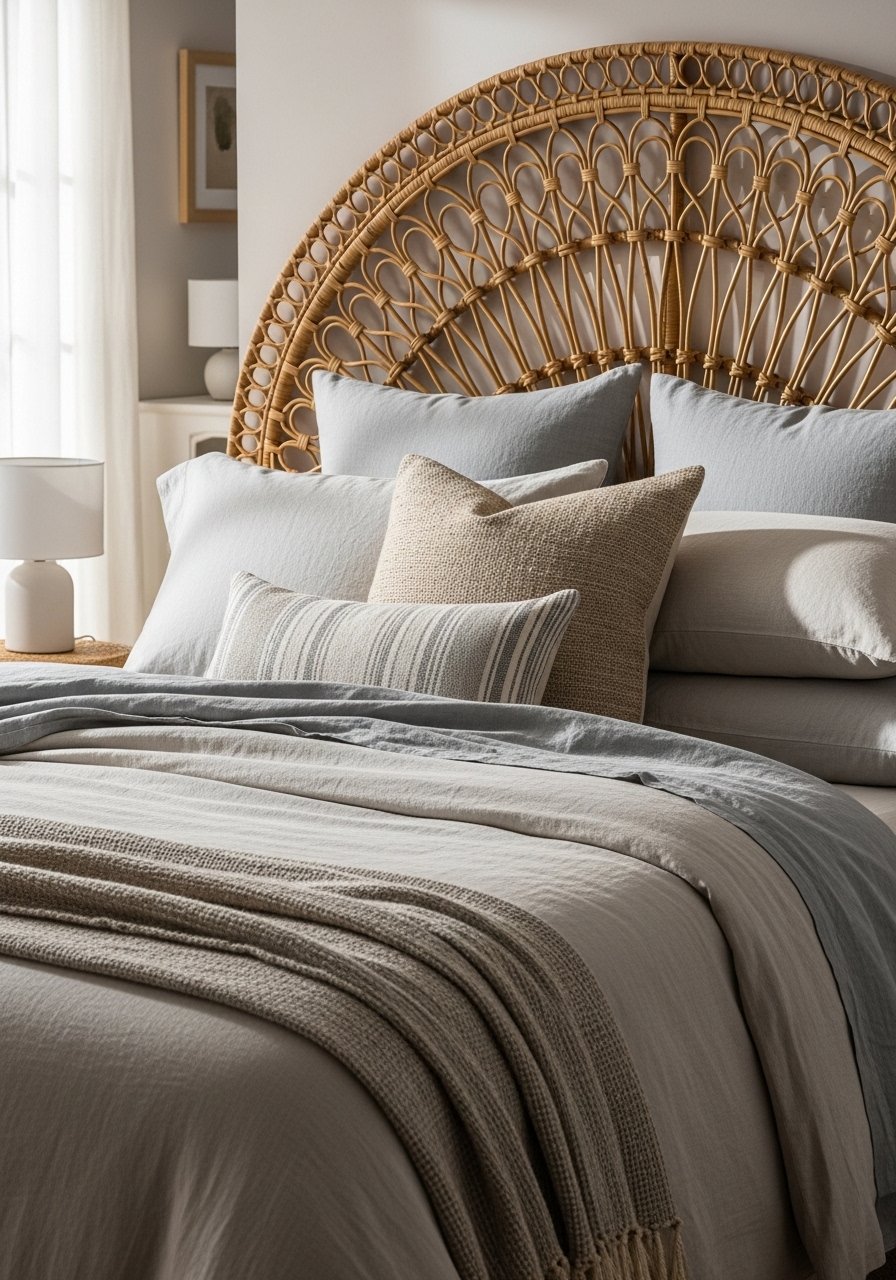 A rattan headboard adds instant character without loud colors. I paired a 60-inch natural rattan headboard with a simple white duvet and linen blend curtains, 84-inch to keep the room airy. In real life the texture reads richer than photos — it becomes the room’s anchor. Common mistake: choosing a glossy finish; stick with matte natural cane so it feels relaxed. Add an 8×10 jute rug under the bed to ground everything.