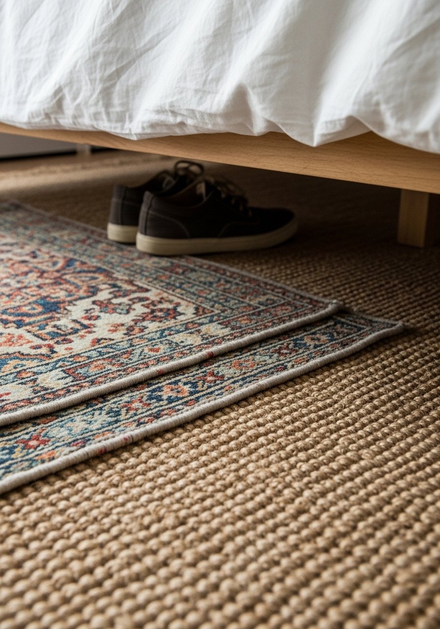 Layering a 5×8 patterned rug over an 8×10 jute area rug creates instant depth and a grounded feeling. I left the front legs of the bed on the larger rug and centered the smaller runner for balance — odd numbers and asymmetry work best. Avoid small rugs that float in the middle of the room; they make the space look disjointed. This combo makes my bedroom feel warmer on cold mornings and visually richer without feeling cluttered.