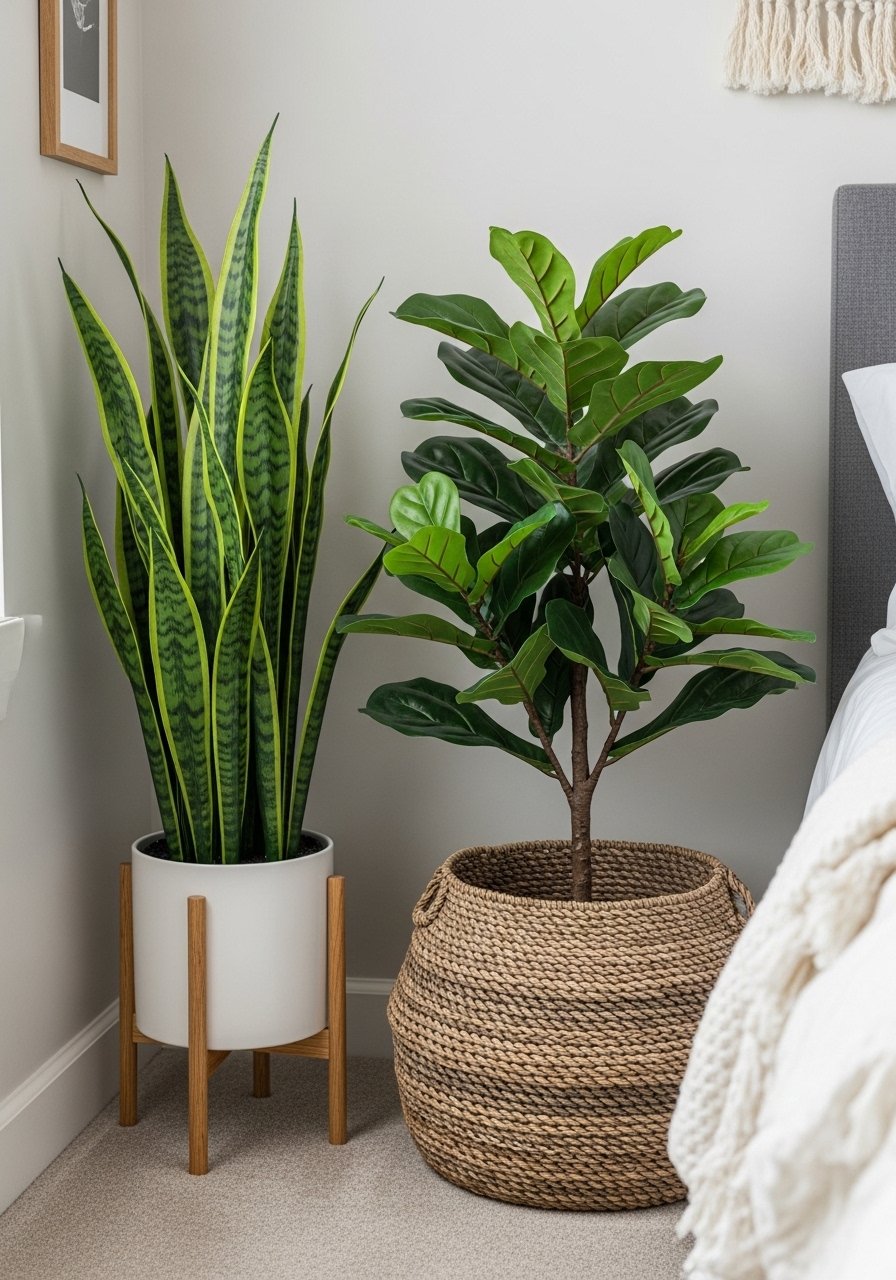 Mix real and faux plants: Combine a real snake plant with a realistic artificial fiddle leaf for drama without upkeep.
