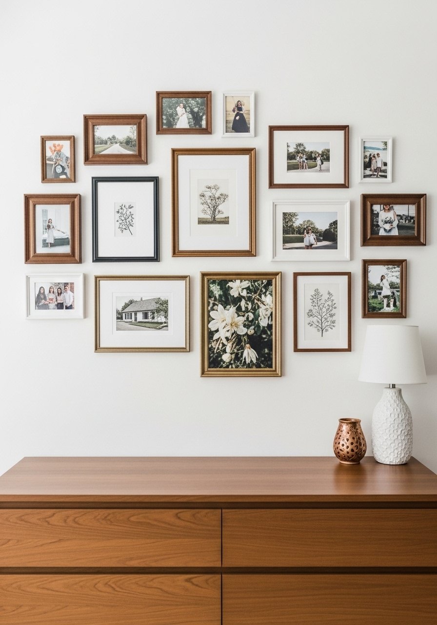 I built a gallery wall from thrifted frames, painting mismatched pieces in a warm beige and pairing them with new white mats. Then I added small prints and family photos for warmth. I buy white picture mats 11×14 to standardize the look. Avoid matching everything exactly; the charm is in subtle variation. This approach gives personality and a collected feeling without looking chaotic.