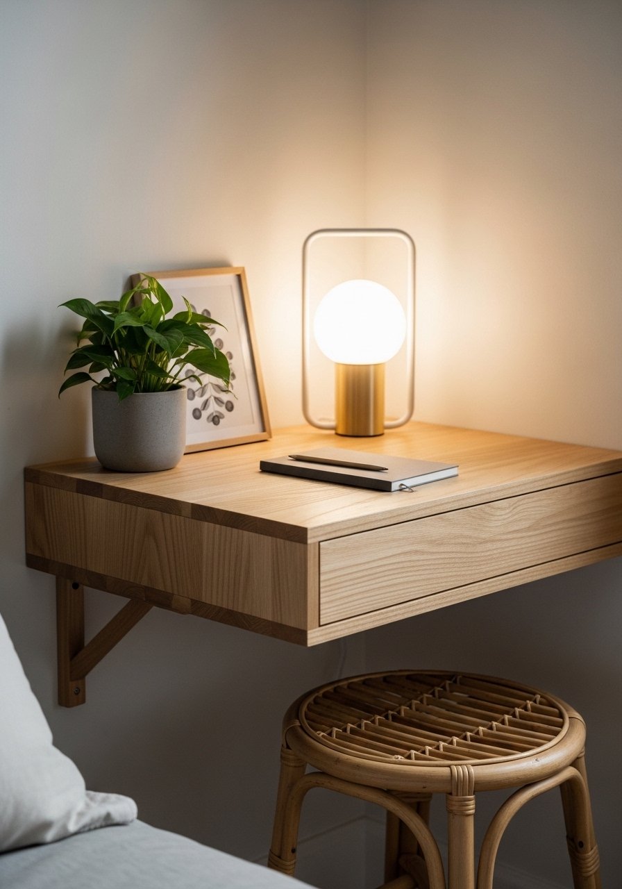 I set up a 30-inch floating desk on a spare wall and styled it with a small lamp and woven stool. It’s enough for a laptop and makes the bedroom multi-use without feeling like an office. I added a small shelf above for plants and used a floating shelf white oak for storage. Mistake to avoid: choosing a desk too deep — keep it narrow so the room still breathes. This gives function while preserving the relaxed vibe.