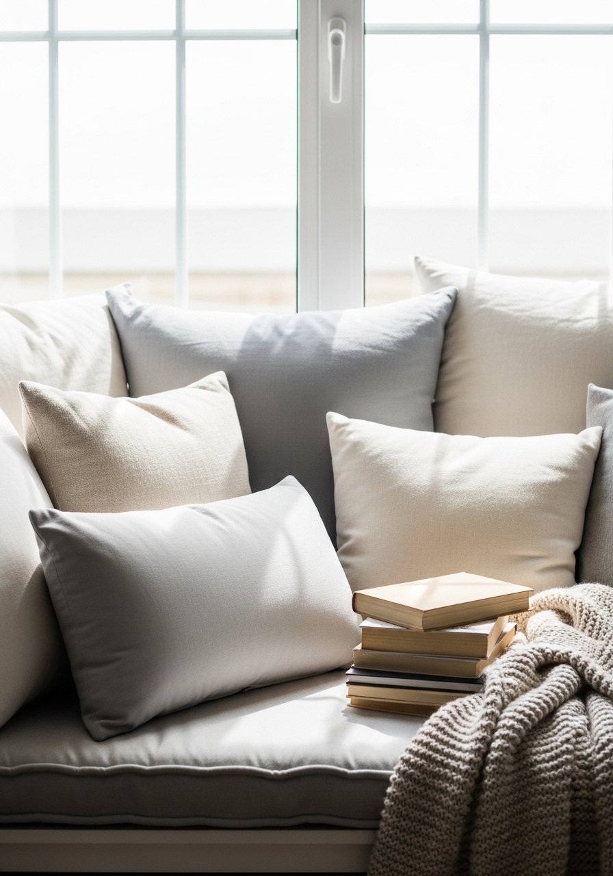 I created a soft window seat with a custom cushion and a stack of layered pillows, including two euro-size textured covers. A cream chunky knit throw folds over the edge. This spot became my favorite reading corner. Mistake to avoid: too many firm pillows; mix soft and supportive for comfort. The window seat adds warmth and makes a bedroom feel intentional without a lot of extra furniture.