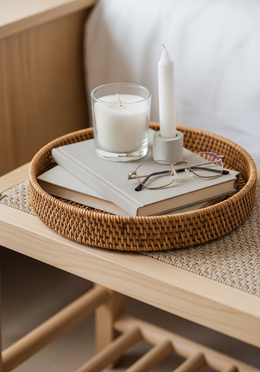 A small rattan tray corrals bedside clutter: glasses, candle, and watch. I use a 12×8 tray on my bench for easy reach. A reed diffuser set adds a subtle scent without flame. The mistake is using a tray that’s too small; it should hold daily essentials comfortably. This keeps surfaces tidy and looks intentional in real life, not staged.