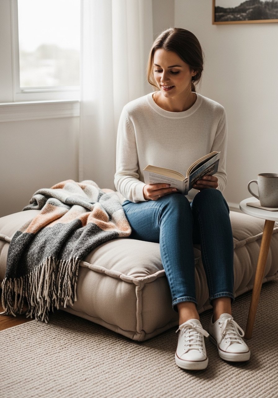 I created a floor-level reading nook with a 30-inch round floor pillow and a low side table. It’s simple and feels inviting. I used a cream chunky knit throw and an extra textured pillow for comfort. Mistake to avoid: using an overly firm floor cushion; choose soft, squishy fills. This nook is an easy, budget-friendly way to add another cozy corner without heavy furniture.