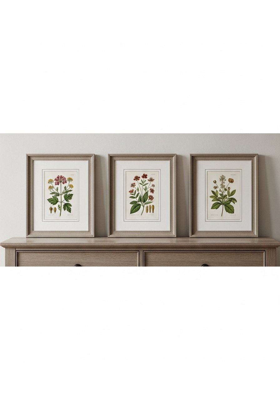 I use three 11×14 botanical prints in matching frames to create a calm, repetitive rhythm. The uniform frames keep the display from feeling chaotic. I use white picture mats 11×14 to make thrifted frames look elevated. Mistake to avoid: mixing too many frame finishes — pick one metal or wood tone. This creates a cohesive focal point that reads intentional and restful.