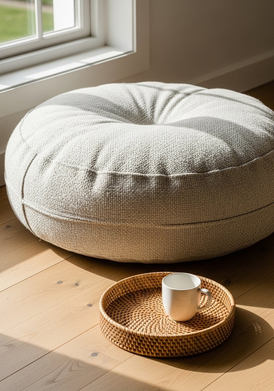 An oversized floor cushion provides flexible seating for guests and a relaxed vibe. I use a 36-inch cushion with a removable cover in a neutral linen blend so it’s washable. Pair with a low table for drinks. Mistake to avoid: choosing a non-washable cover — life happens. This adaptable seat keeps the room casual and welcoming without adding visual weight.