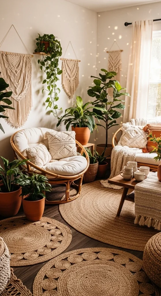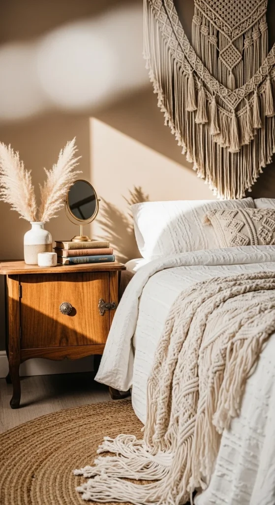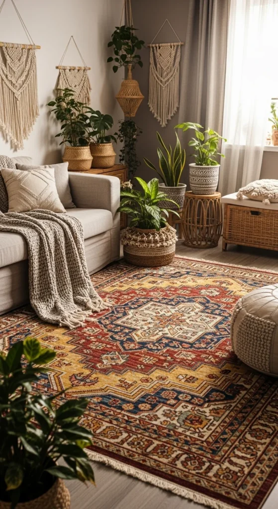 Layering texture is the quickest way to get that relaxed boho feel. Try pairing a macramé wall hanging with a chunky jute rug. The mix creates warmth without looking messy. Start small by adding a woven throw or textured cushion, then build up slowly. If you’re decorating on a tight budget, check thrift stores for older jute rugs—they often look even better with a little wear. Hang macramé using removable hooks, so you can change the layout anytime.
