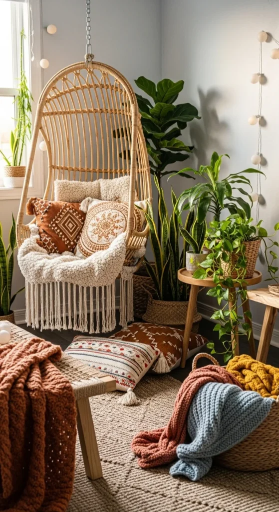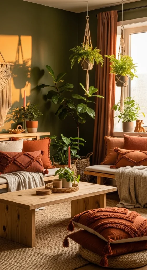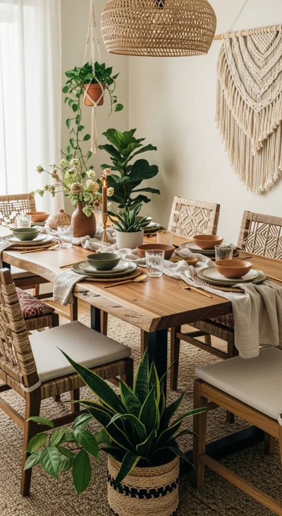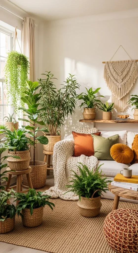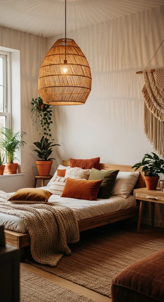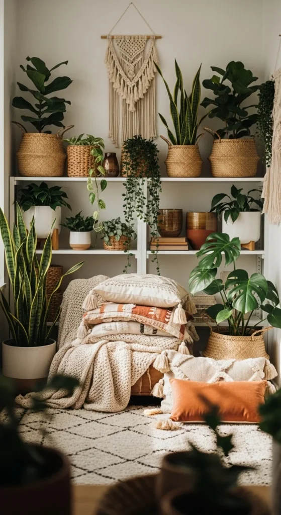 Plants are essential in boho interiors. They add softness and life, especially in corners that feel empty. If you’re new to plants, start with low-maintenance choices like pothos or snake plants. Use woven baskets instead of plastic planters to fit the theme. For a budget trick, reuse old baskets and line them with plastic to hold pots.