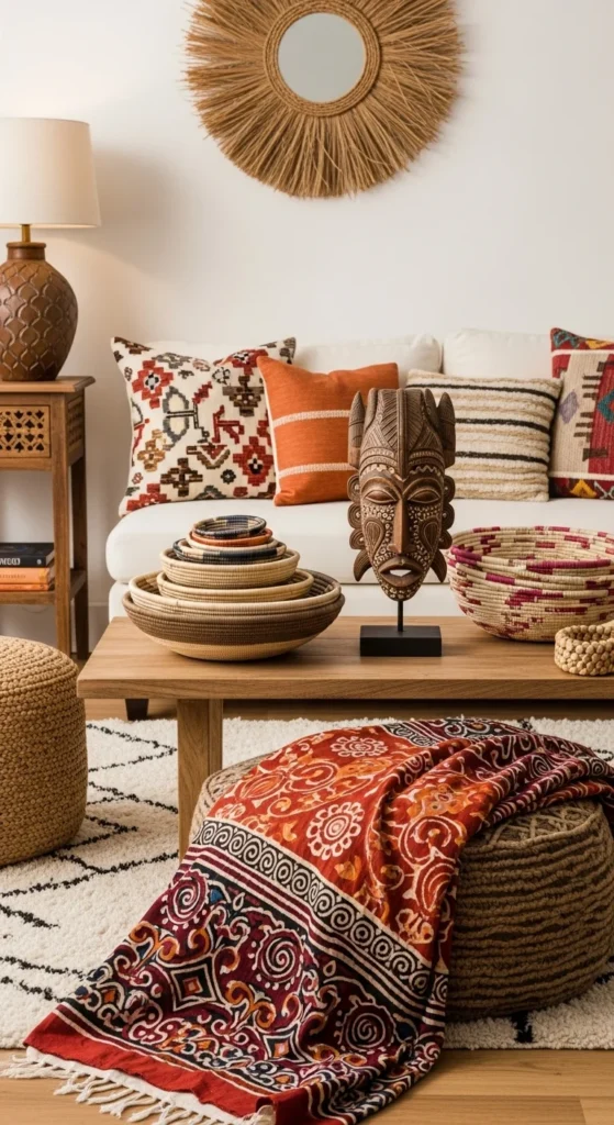 Bedding is an easy way to introduce global influence. Look for kantha quilts, block-printed sheets, or ikat pillow covers. Mix patterns in similar tones for balance. Add a simple throw at the foot of the bed.