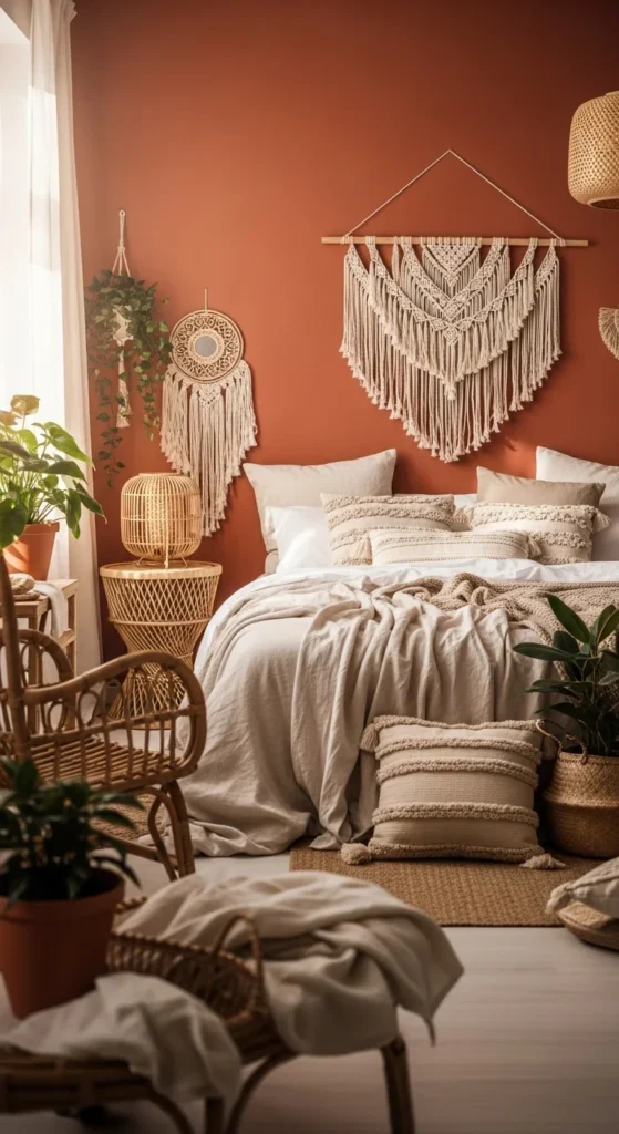 Terracotta walls give warmth and softness. Try painting just one wall behind your bed or sofa. Add creamy linens, wood accents, and plants. It’s an easy weekend project that transforms the room.