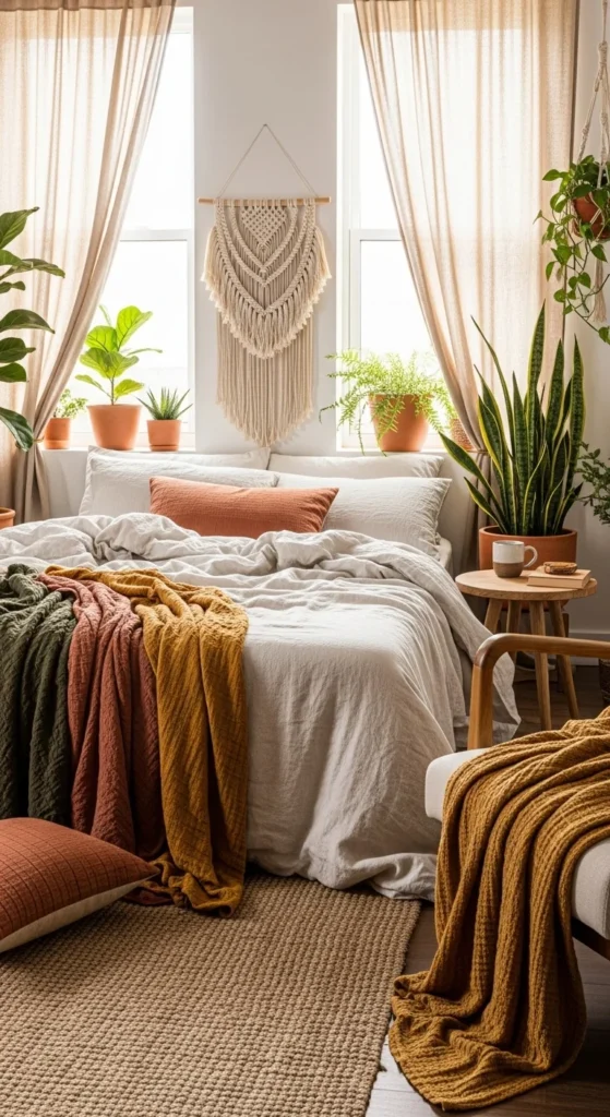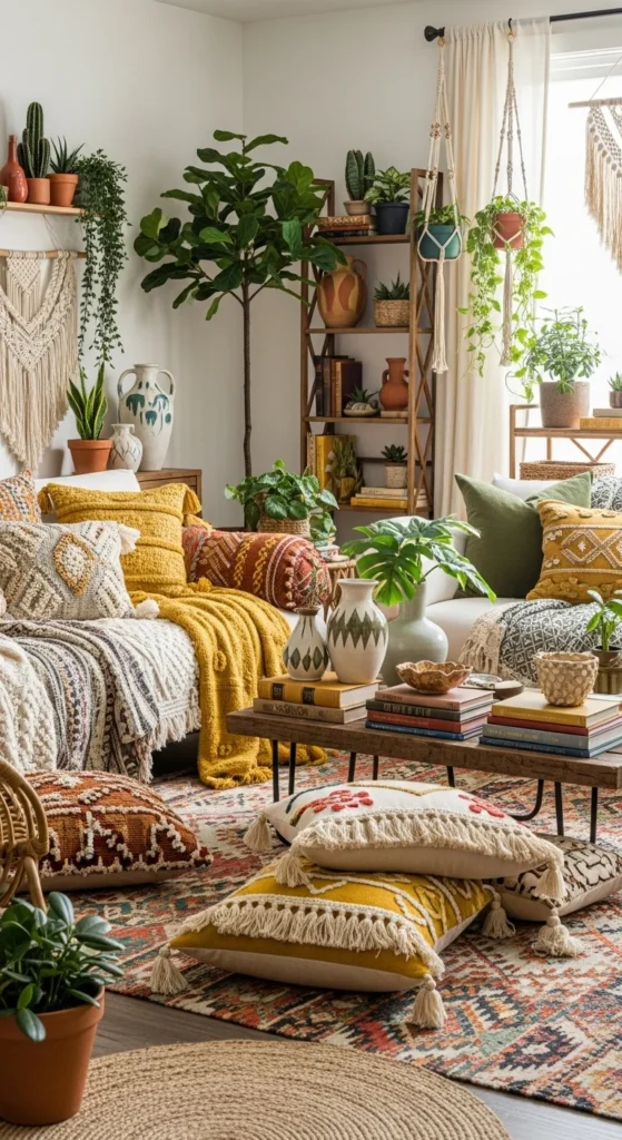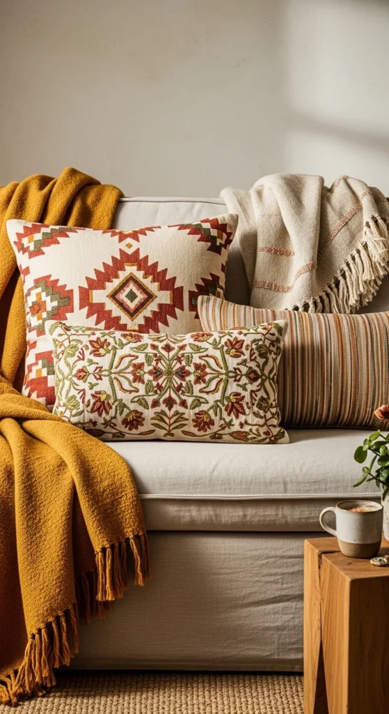 Mixing patterns is part of boho design, but balance matters. Stick to a single color family to keep harmony. For example, mix olive stripes with beige florals. Add just one bold pattern, then soften the rest. If you’re unsure, create a “pattern trio”: one bold, one simple, one textured.