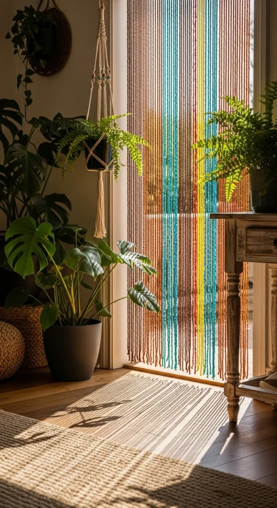 Beaded curtains bring a retro boho mood. Hang them in doorways or closets. They create movement without blocking light. Choose wood beads or neutral tones for a calmer look.